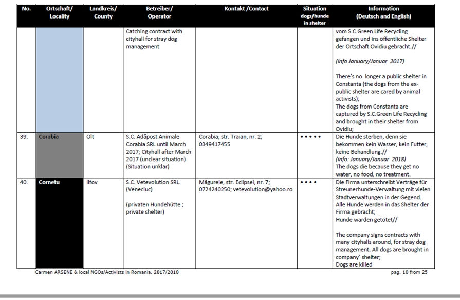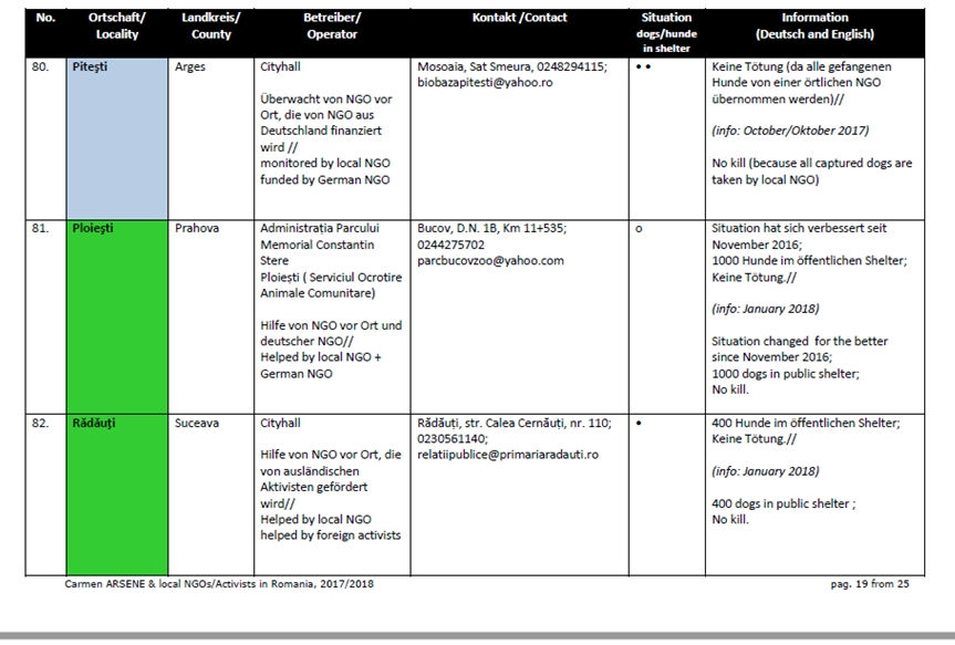 Berichtigt falsche Angaben und sendet diese Frau Dr. Carmen Arsene zu, damit diese geändert werden können. Hilfreich wäre zu wissen welche Stiftung oder Verein das Management des jeweiligen PS übernommen hat! Es ist widerrechtlich, dass Privatpersonen die Verwaltung eines PS übernehmen (s. Dokument der rum. Veterinärbehörde ANSVSA). Nur anerkannte Vereine oder Stiftungen sind dazu berechtigt.